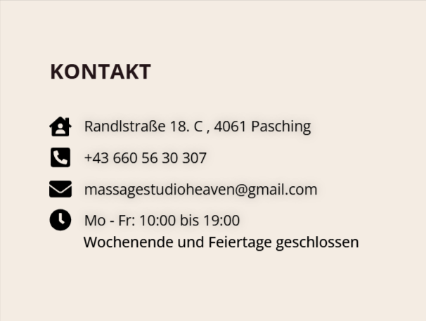 Dear guests! Please book appointments EARLY! Unfortunately, we are NOT always able to book SHORT-TERM appointments Appointment enquiries ONLY possible by telephone and SMS. Randlstraße 18.C, 4061 Pasching ( The studio is located 450 m from the Plus City; Linz-Hörsching airport 3.7 km away ) +43 660 56 30 307 massagestudioheaven@gmail.com